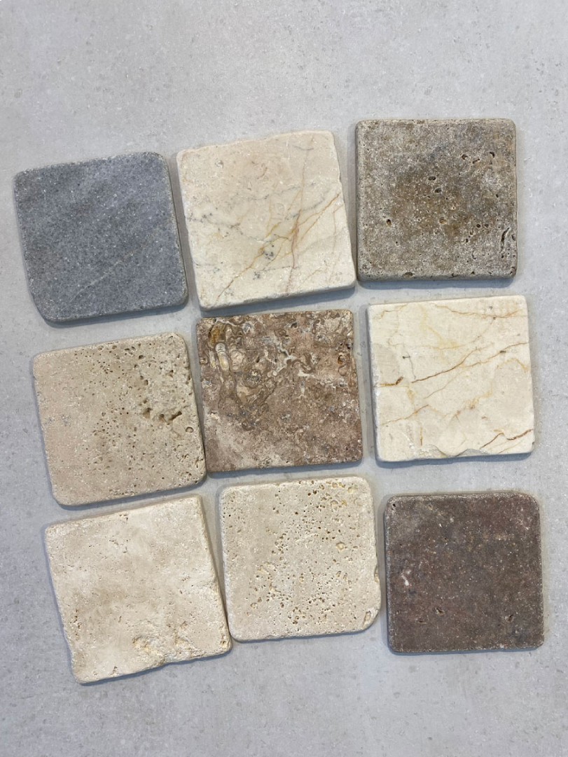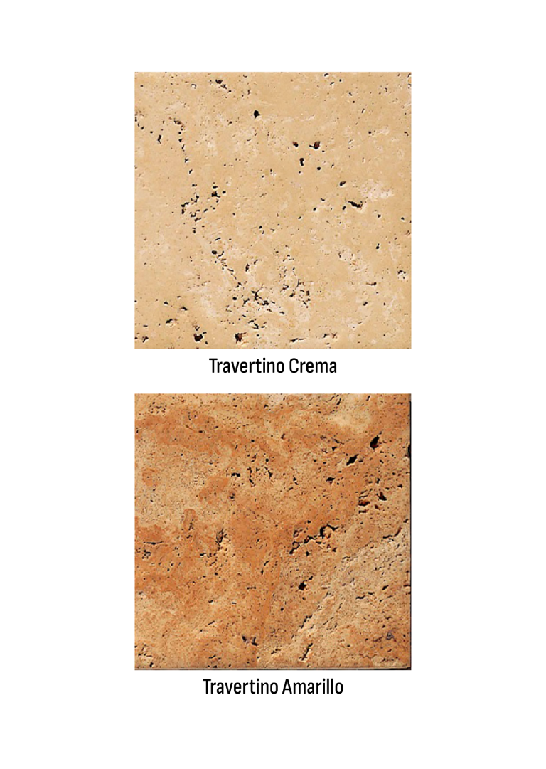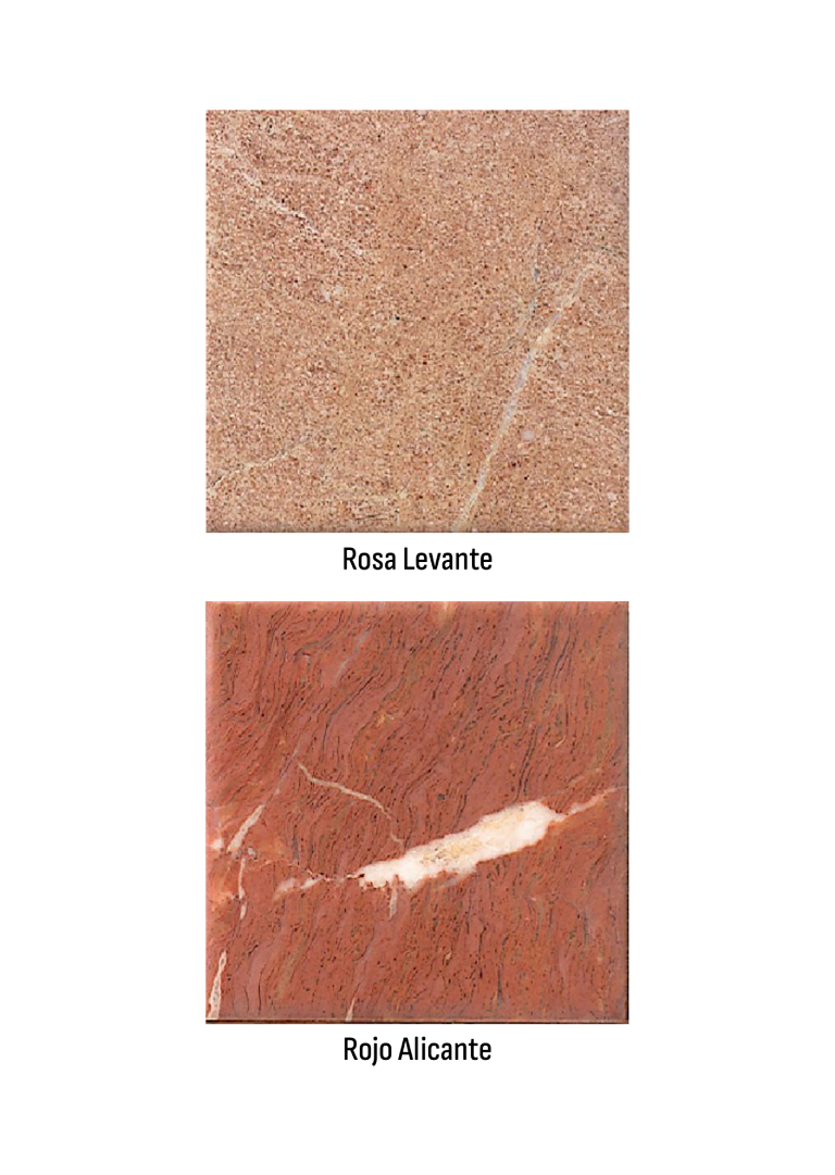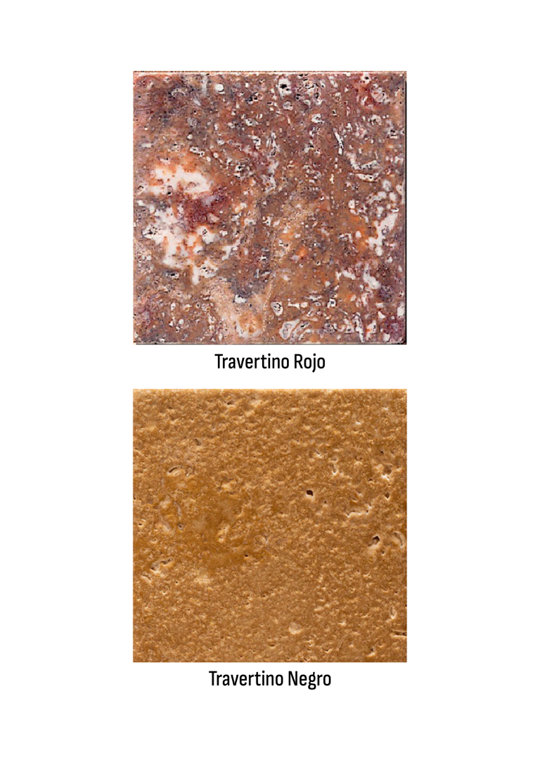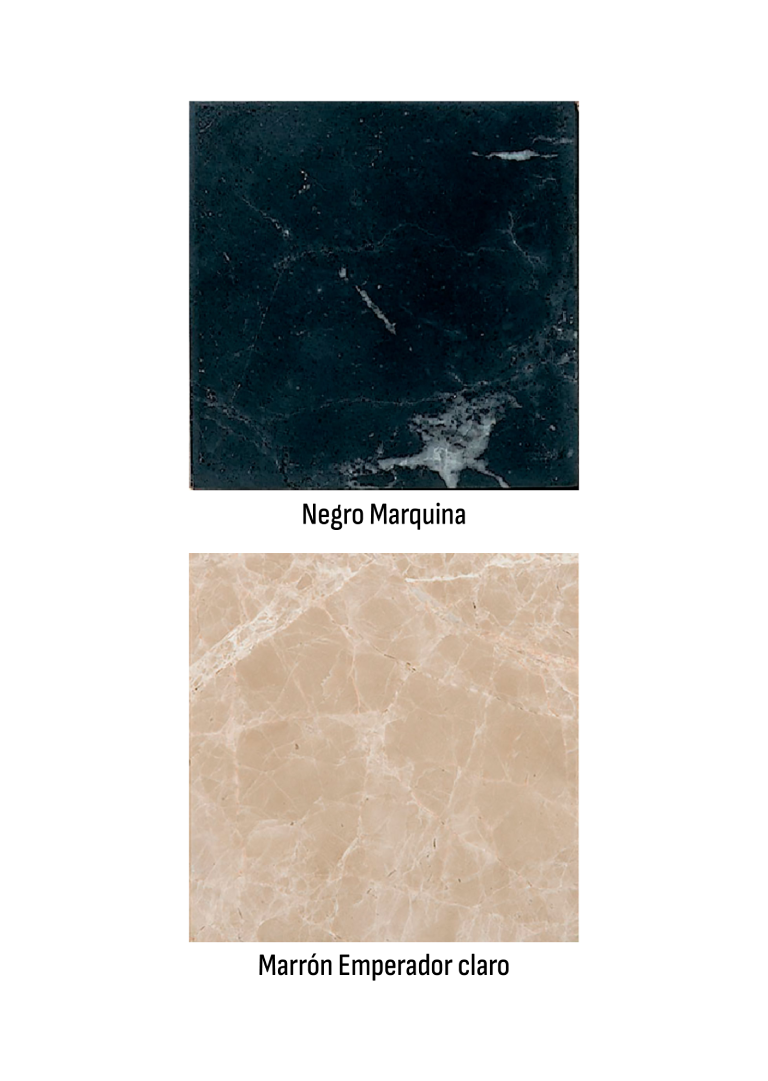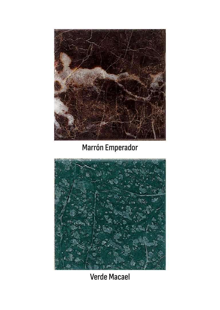 Verde Macael, Travertino Rojo, Travertino Noche, Travertino Crema, Travertino Amarillo, Rosa Levante, Rojo Alicante, Negro Marquina, Marrón Emperador, Gris Macael, Crema Marfil y Blanco Macael